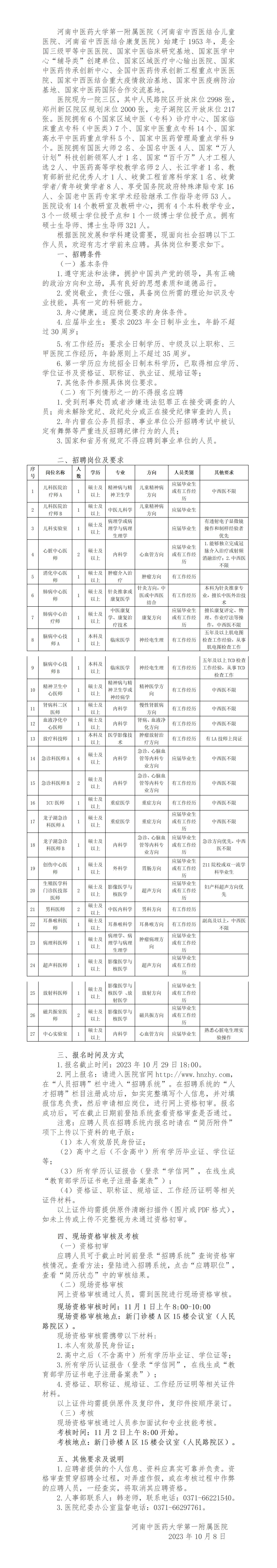 河南中医药大学第一附属医院2023年度招聘工作人员公告(第6号)