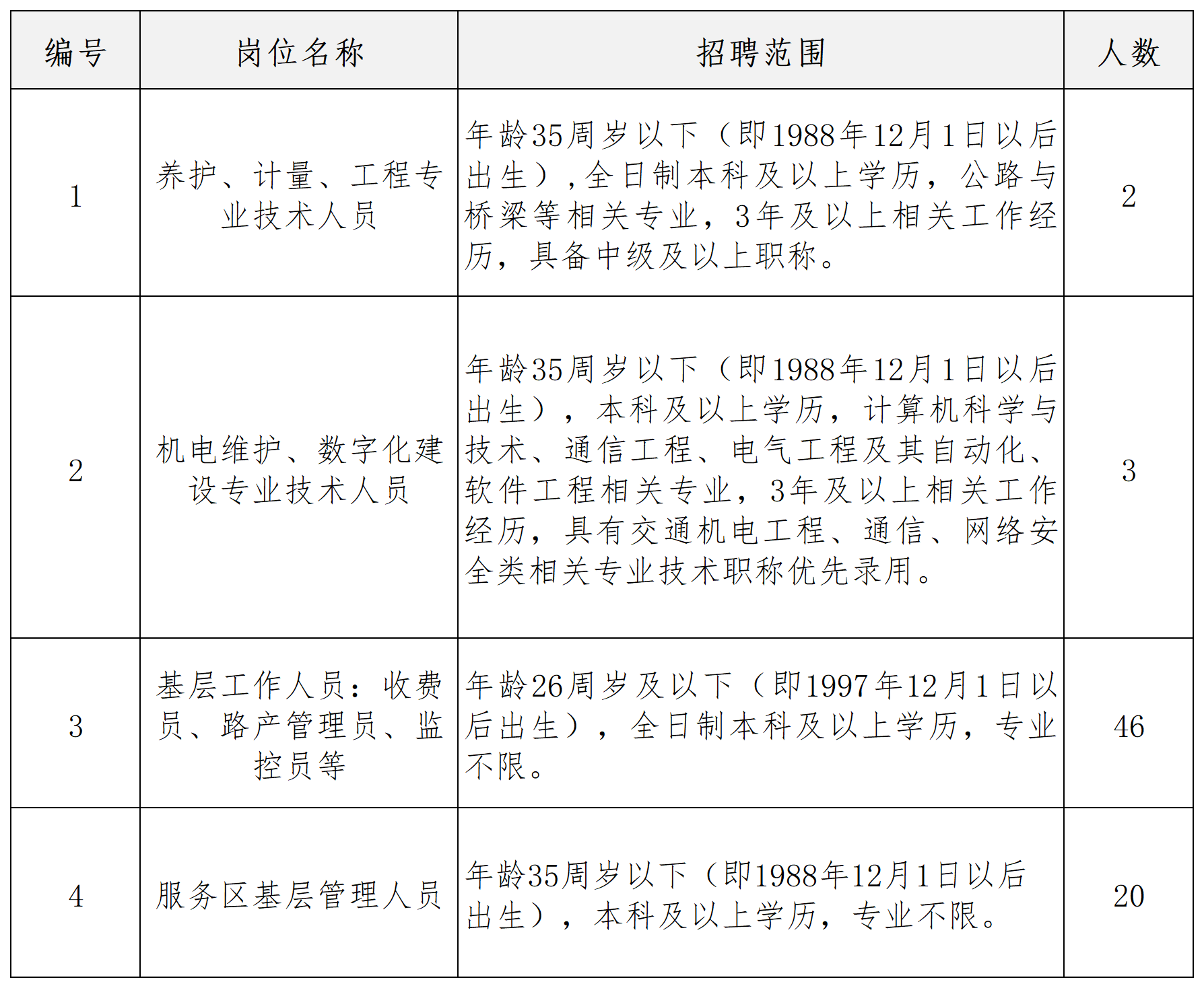 本次招聘养护、计量、工程专业技术人员2人,机电维护、数字化建设专业技术人员3人、基层工作人员46人(公司各基层单位收费员、路产管理员、监控员等)、服务区基层管理人员20人。共计71人。
