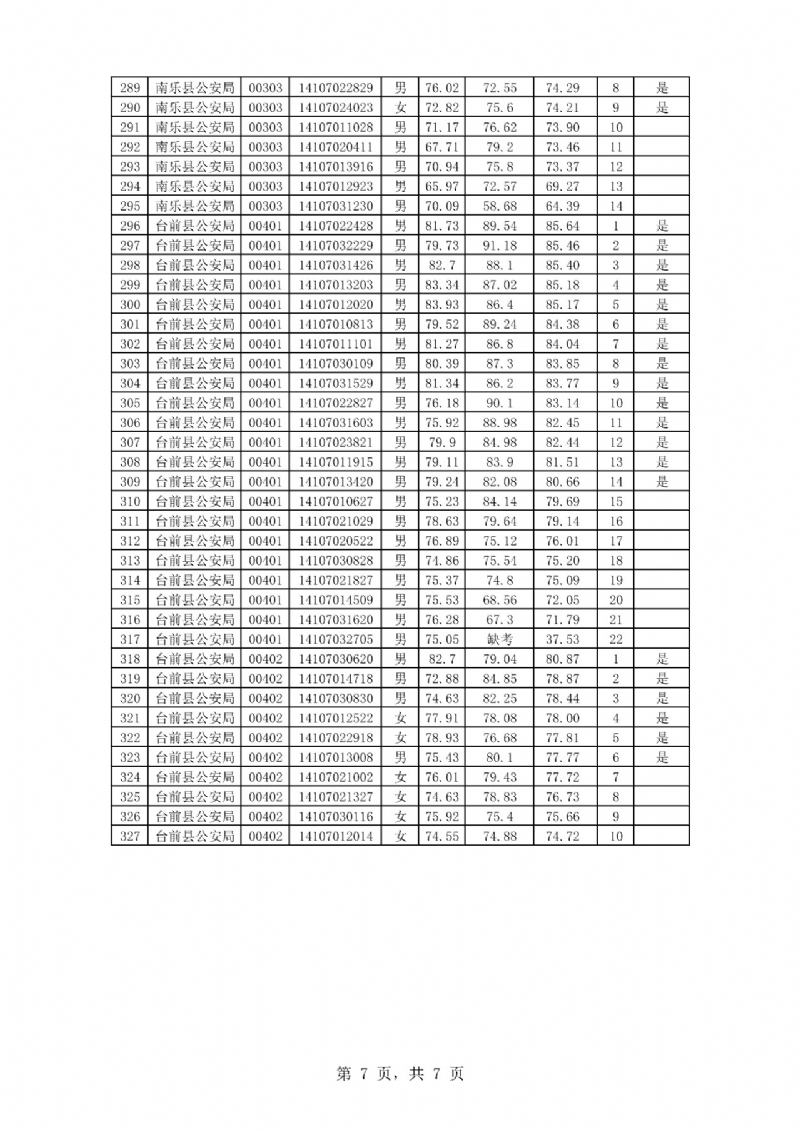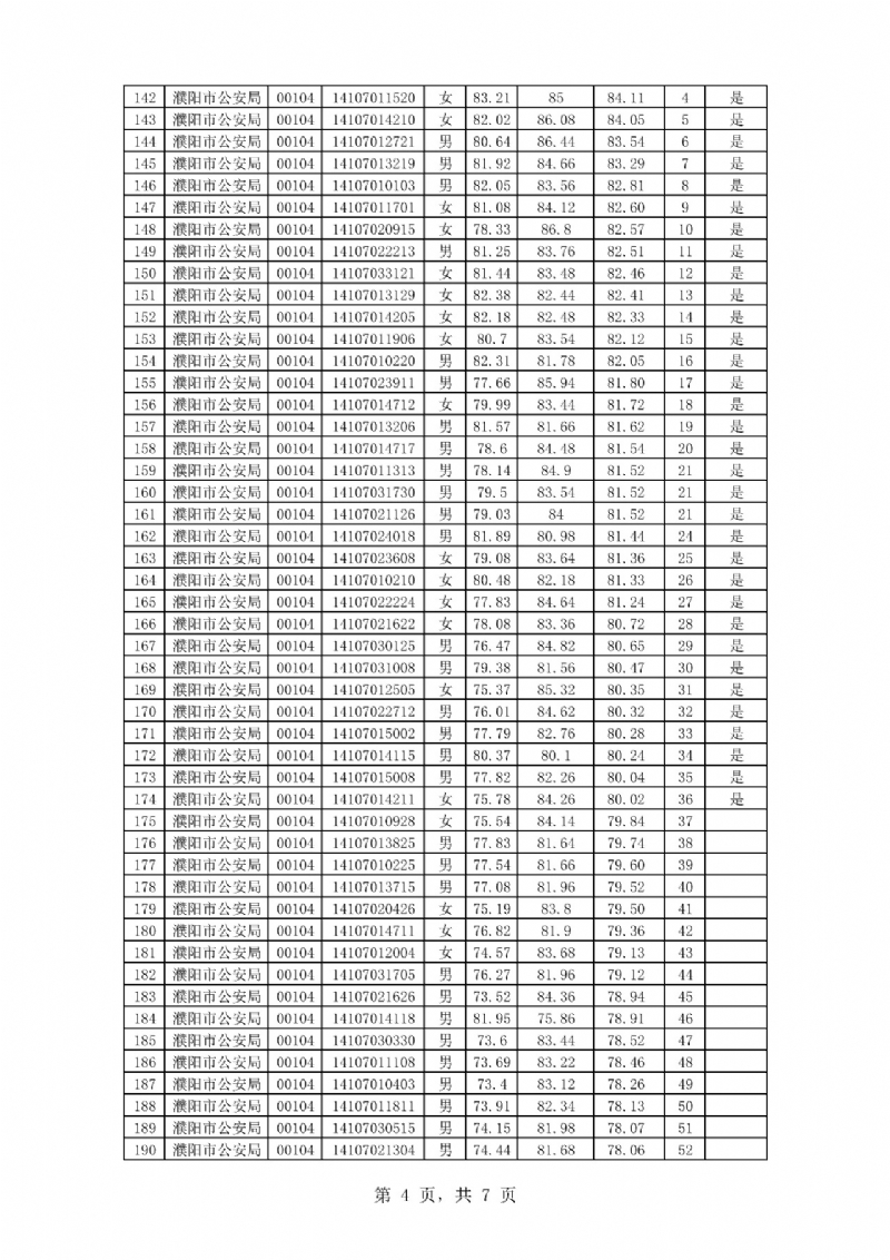 2022年濮阳市公安机关公开招聘警务辅助人员考试总成绩公示及进入体检人员公告根据《2022年濮阳市公安机关公开招聘警务辅助人员公告》要求,濮阳市公安局于2023年4月9日组织了面试并当场公布了面试成绩。根据计划招聘人数1:1.2的比例,按照考试总成绩(笔试成绩×50%+面试成绩×50%)从高分到低分排序,确定200名考生进入体检。现将全体参加面试考生的考试总成绩和进入体检人员名单予以公布(见附件)。体检标准参照人力资源社会保障部、国家卫生计生委、国家公务员局2016年12月30日修订的《公务员录用体检通用标准(试行)》(人社部发﹝2016﹞140号)和《公务员录用体检特殊标准(试行)》(人社部发﹝2010﹞82号)第四条执行;根据工作岗位的特殊需要,对报考濮阳市公安局00103职位进入体检的考生需增加《公务员录用体检特殊标准(试行)》(人社部发﹝2010﹞82号)中的第八条体检内容。1.考生须在2023年4月13日(周四)早晨6点30分前到达集合地点,统一乘车到指定医院进行体检。2.考生必须携带本人身份证和笔试准考证原件,现场查验身份并拍照。严禁弄虚作假、冒名顶替;如隐瞒病史影响体检结果的,后果自负。3.体检前请注意休息,勿熬夜,不要饮酒、不要服用药物,避免剧烈运动。体检的当日早晨,不进食、不饮水,保持空腹,女性考生不排尿。4.体检当天需进行采血、B超等检查,请在受检前禁食8-12小时。5.女性考生是否结婚或在月经、怀孕期间,请提前告知体检医护人员。怀孕或可能已受孕者,事先告知医护人员,勿做X光检查。6.请配合医生认真检查所有项目,勿漏检。若自动放弃某一检查项目,将会影响聘用。7.服从命令听从指挥,接受带队工作人员管理,体检过程中不要擅自离队单独行动。不要携带手机等通信工具参加体检,已携带的须交工作人员统一保管,否则按违规处理。9.体检费用由考生本人承担,每人300元,由体检医院收取,请提前备好现金。咨询电话:8820084 监督电话:8820104