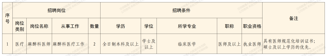 根据实际工作需要,计划面向社会公开招聘麻醉科医疗岗位2名。
