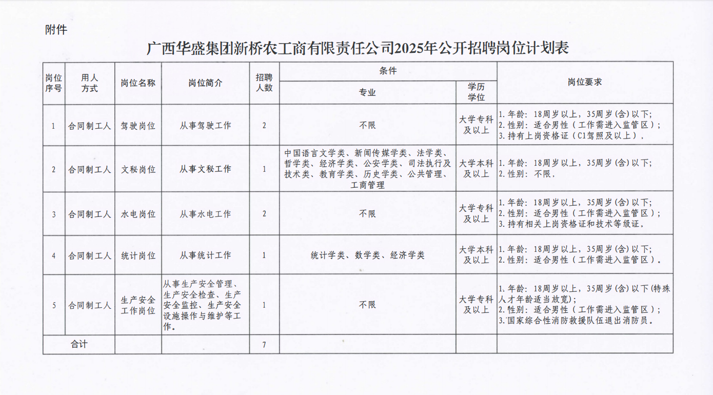 广西华盛集团新桥农工商有限责任公司(以下简称“新桥公司”)是广西华盛集团有限责任公司旗下一家自主经营、独立核算的国有企业,公司位于广西贵港市港北区金港大道1098号。结合工作实际,新桥公司在2025年委托广西红海人力资源有限公司(以下简称“红海公司”)面向社会公开招聘7名合同制工人,现将有关事项公告如下: