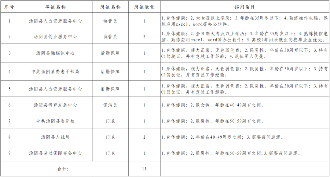 根据《河南省人力资源和社会保障厅 河南省财政厅关于印发<河南省公益性岗位管理办法>的通知》(豫人社办〔2020〕23号)文件精神,为更好地为就业困难群体开展有效就业援助,促进就业困难人员再就业,现向社会公开招聘11名公益性岗位人员。现将招聘有关事项公告如下: