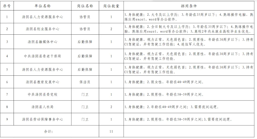 根据《河南省人力资源和社会保障厅 河南省财政厅关于印发<河南省公益性岗位管理办法>的通知》(豫人社办〔2020〕23号)文件精神,为更好地为就业困难群体开展有效就业援助,促进就业困难人员再就业,现向社会公开招聘11名公益性岗位人员。现将招聘有关事项公告如下: