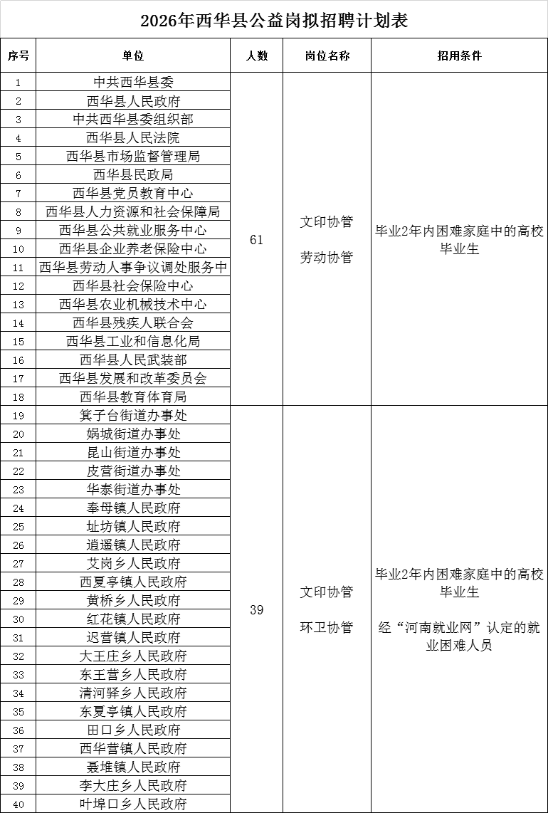 根据《河南省人民政府关于进一步做好稳就业工作的实施意见》(豫政[2020]14 号)、《河南省人力资源和社会保障厅、河南省财政厅关于印发河南省公益性岗位管理办法的通知》(豫人社办[2020]23号) ,按照公平、公正的原则,西华县公开招聘公益性岗位工作人员100人,现将有关事项公告如下: