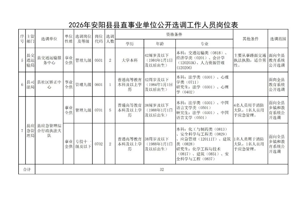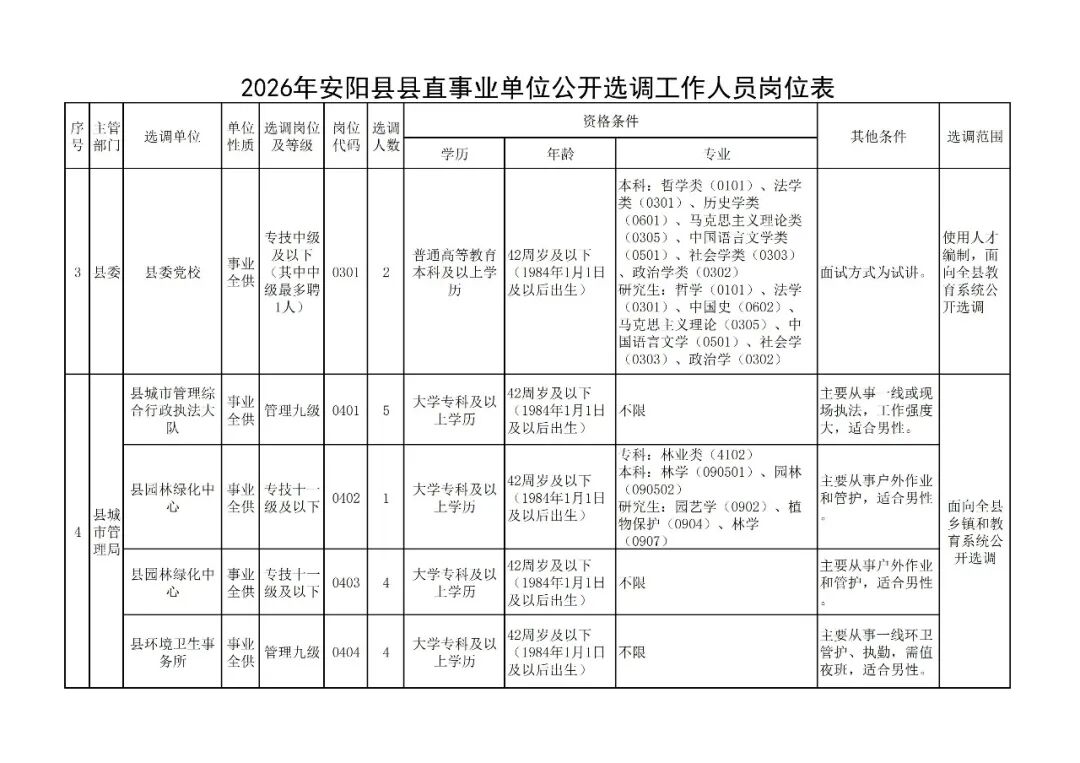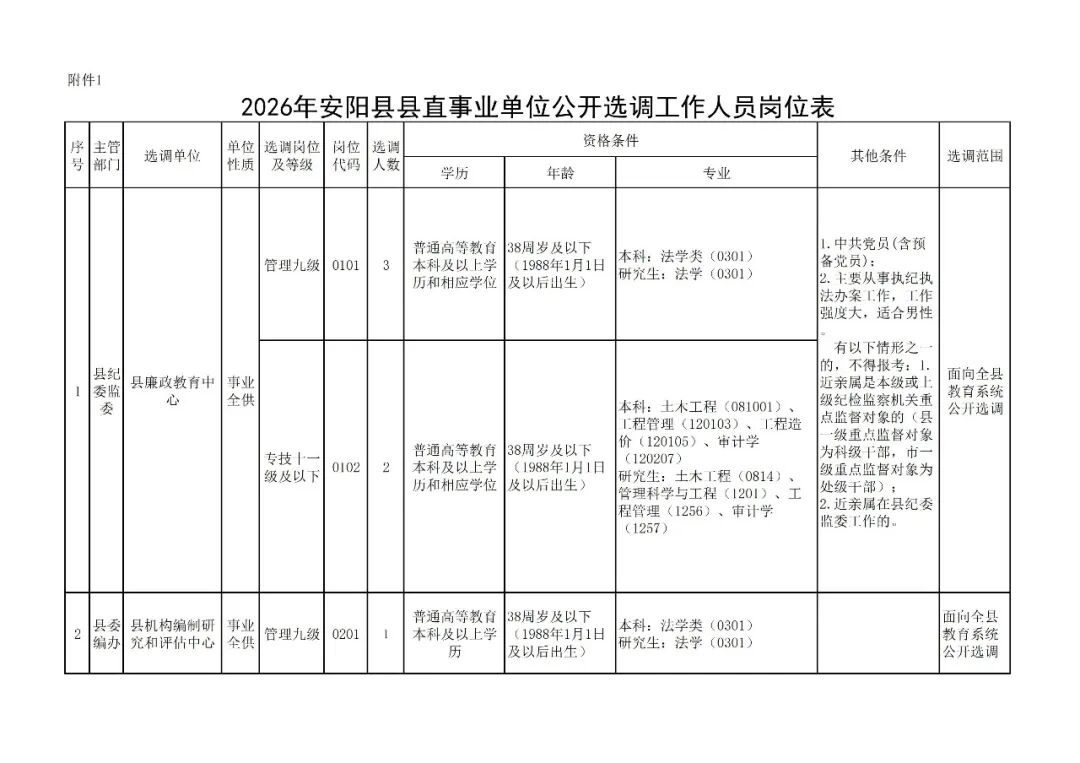 具体选调范围、岗位、报名资格条件等详见《2026年安阳县县直事业单位公开选调工作人员岗位表》(附件1)。