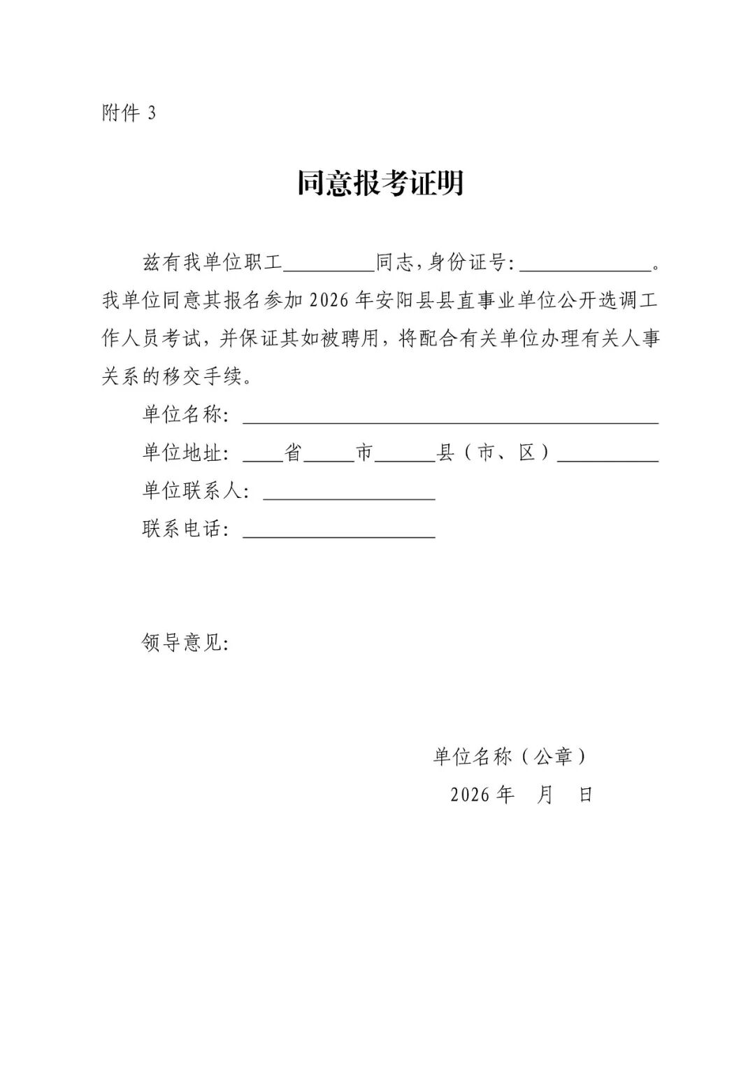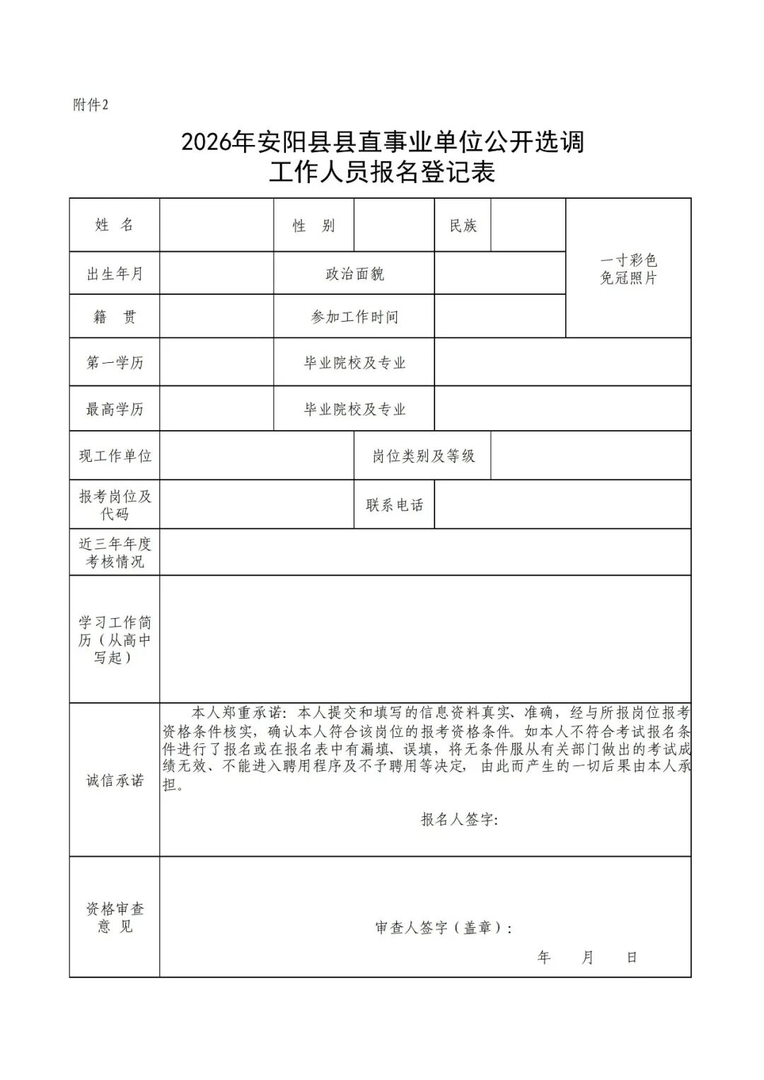 2.2026年安阳县县直事业单位公开选调工作人员报名登记表;