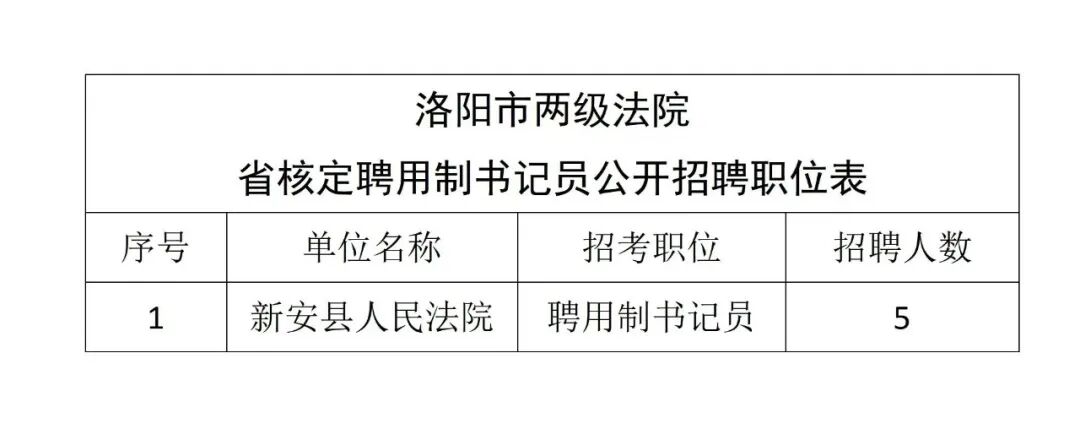 根据工作需要,洛阳市两级法院面向社会公开招聘聘用制书记员。其中,新安县人民法院招聘5人。