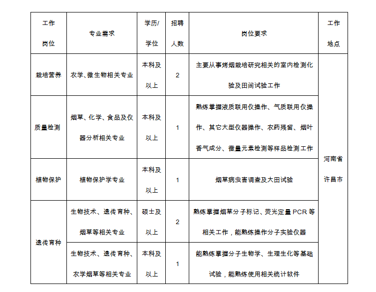 河南省农业科学院烟草研究所隶属于河南省农业科学院,主要开展烤烟新品种选育与推广、烟草病虫害防治、烤烟优质丰产栽培技术与烘烤技术研究,烟草生理生化技术研究,烟叶品质分析与化验、烟区土壤监测等。为加强团队建设、推进烟草学科发展,现公开招聘编外科研助理人员7名,欢迎有志之士前来应聘。